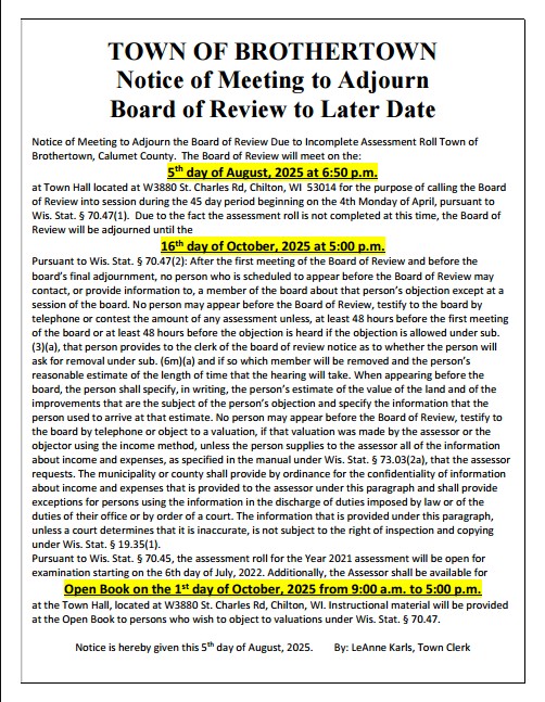 Posted on August 24, 2025, Edited August 24, 2025 by LeAnne Karls Notice of Open Book and Board of Review